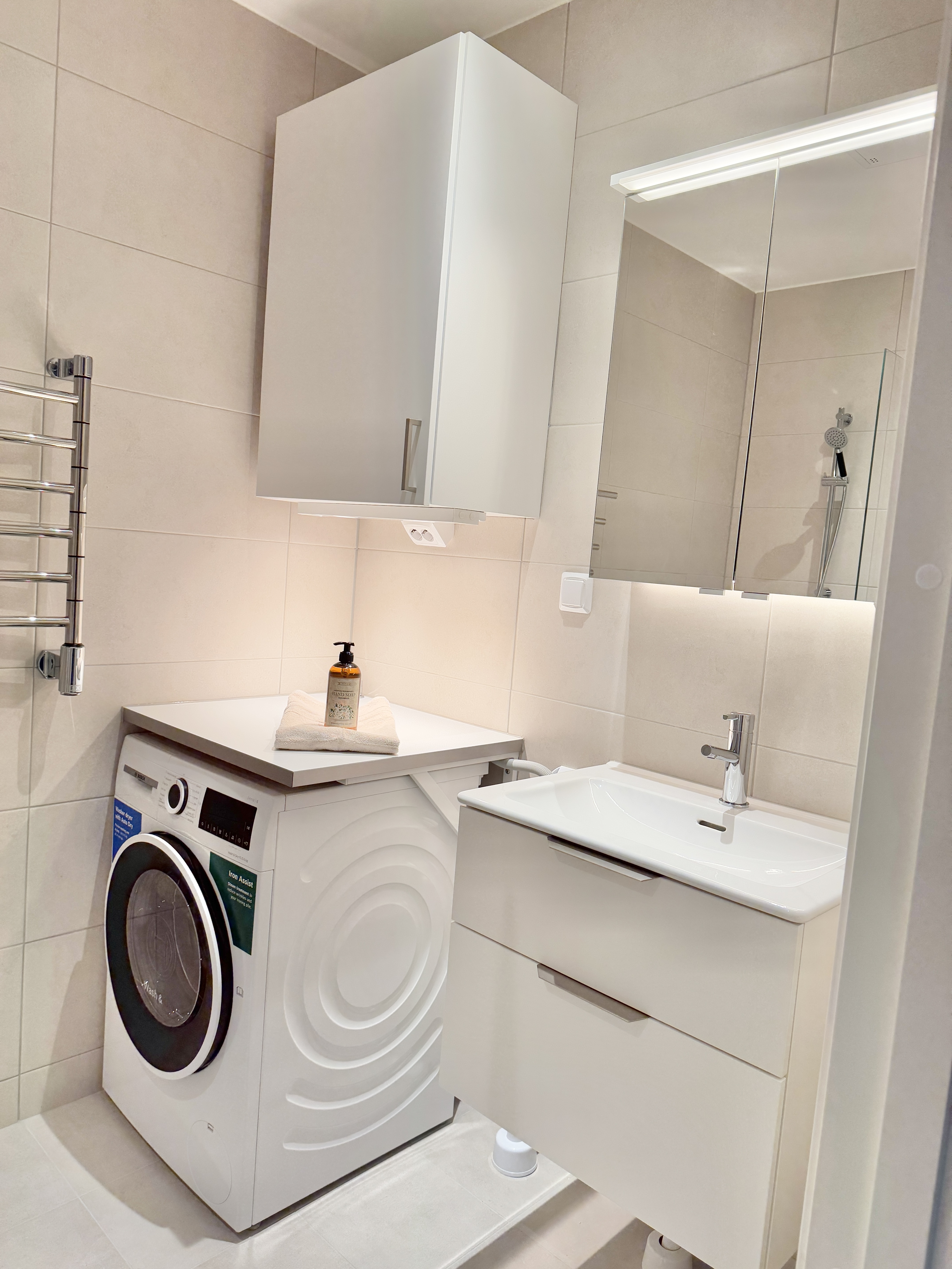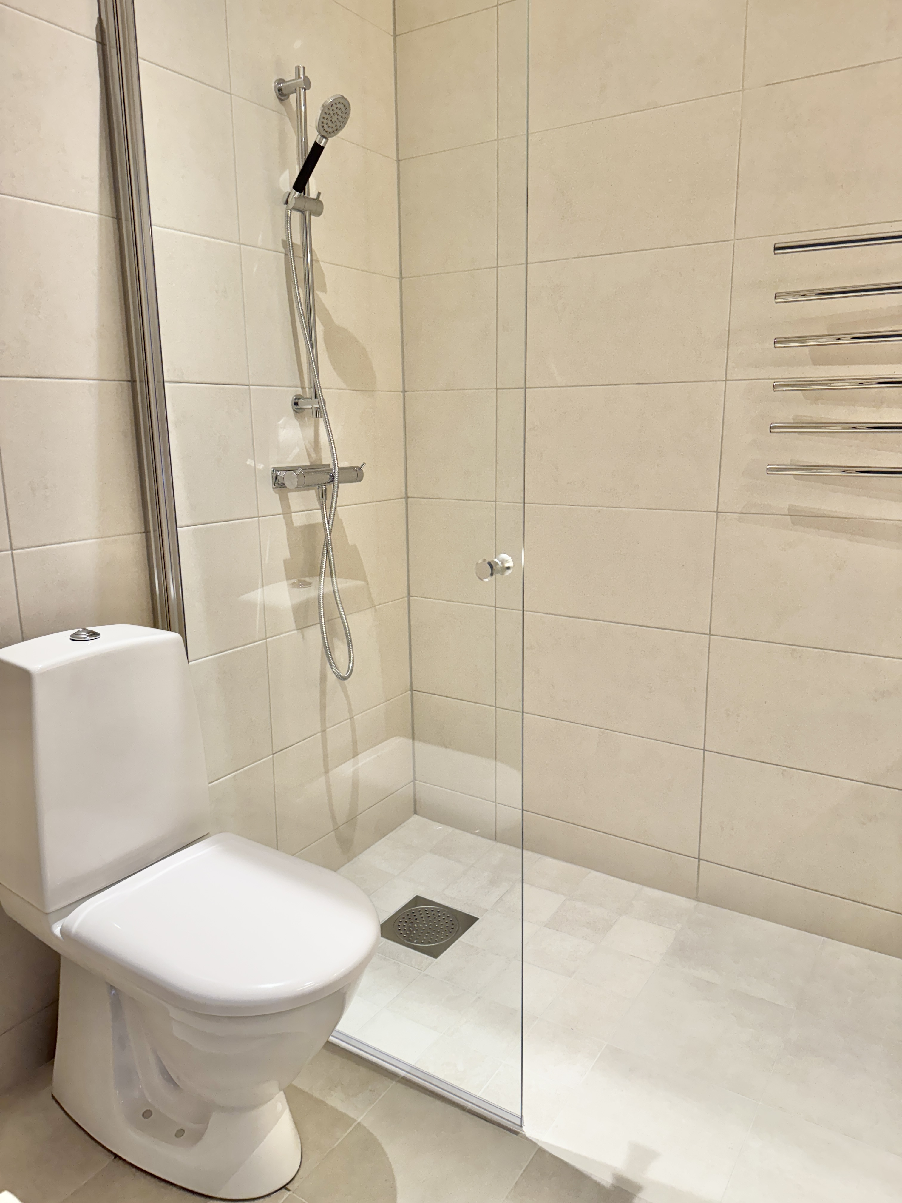 Trevlig hall med beigegrå klinkers och bra förvaring i garderober. Rymligt helkaklat badrum i beiget med klinkers, takdusch, handdukstork & kombitvättmaskin (dvs med torktumlarfunktion) samt bra förvaring i överskåp och bänk.
